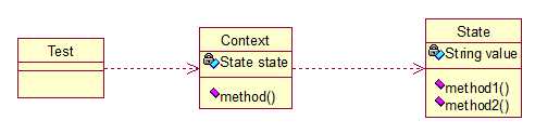 public class Test { public static void main(String[] args) { State state = new State(); Context context = new Context(state); //设置第一种状态 state.setValue("state1"); context.method(); //设置第二种状态 state.setValue("state2"); context.method(); } } //输出: execute the first opt! execute the second opt!
