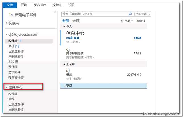 使用上面截图中的示例,所讨论的用户是"dj",共享邮箱名为"信息中心"。使用Get-MailboxPermission来检查用户是否已被授予邮箱权限。