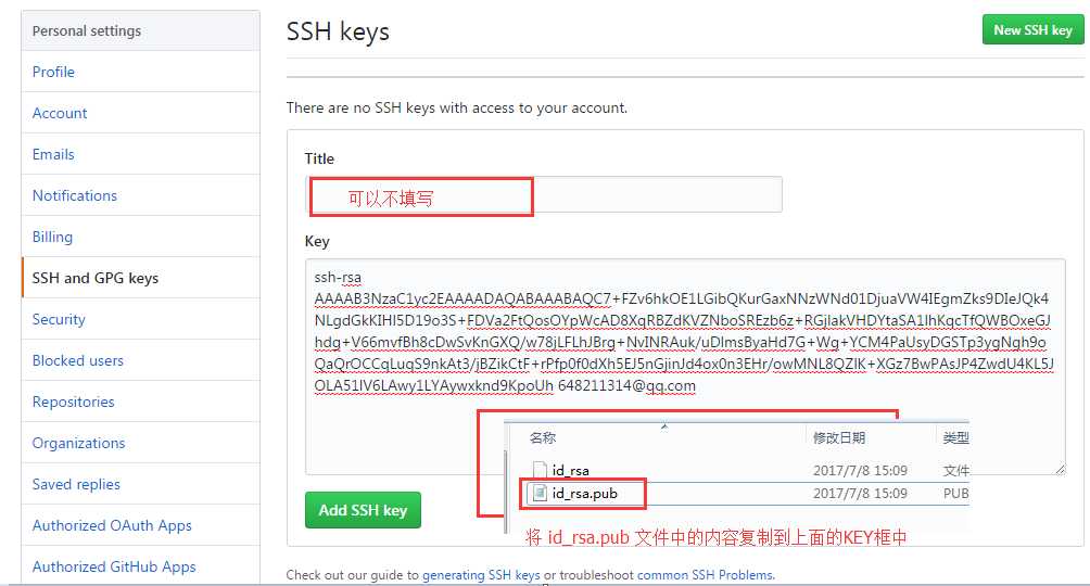 如果显示没有密匙,则输入ssh-keygen -t rsa -C “邮箱地址”创建密匙