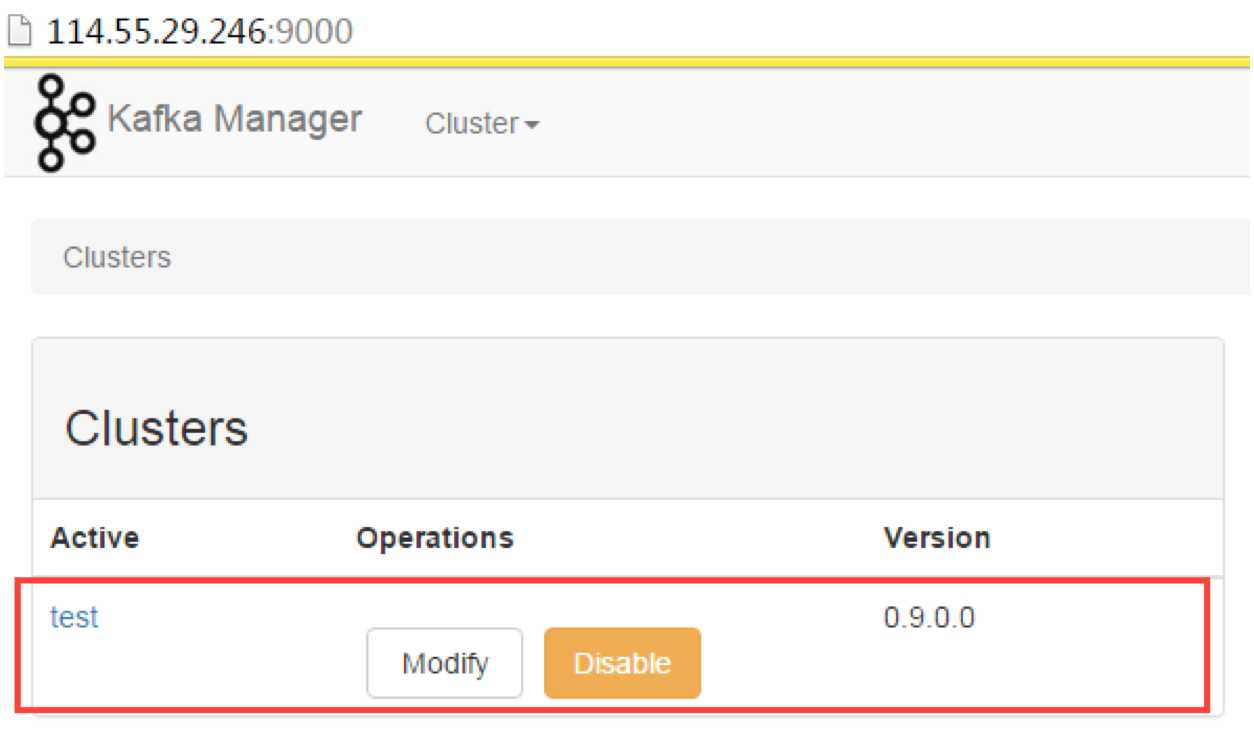 注意:安装完成后需要手动添加Cluster。添加Cluster是指添加一个已有的Kafka集群进入监控列表,而非通过Kafka Manager部署一个新的Kafka Cluster,这一点与Cloudera Manager不同。