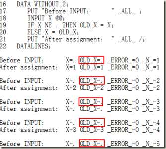 DATA WITHOUT_2; PUT "Before INPUT: " _ALL_ ; INPUT X @@; IF X NE . THEN OLD_X = X; ELSE X = OLD_X; PUT "After assignment: " _ALL_ /; DATALINES; 1 2 . 3 ;