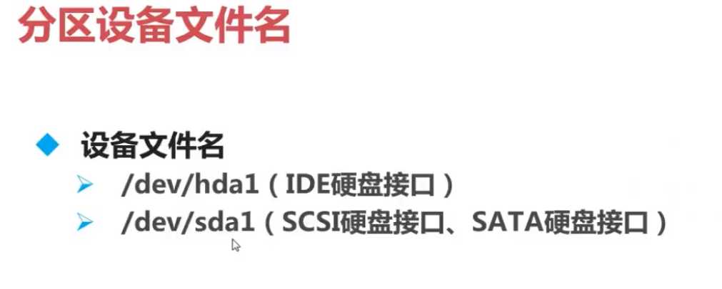 格式化后,就是分配盘符,win系统直接C、D、E、F……排字母分配,而linux中是为盘符起一个文件名(linux中一切皆文件,硬盘、鼠标、甚至用户等等),再分配盘符!下图是linux系统为没个设备起的名称: