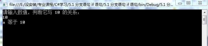 using System; using System.Collections.Generic; using System.Linq; using System.Text; using System.Threading.Tasks; namespace _5._1_分支语句_if_语句 { class Program { static void Main(string[] args) { //判断变量 a 中存放数值与 10 的关系 Console.WriteLine("请输入数值,判断它与 10 的关系:"); int a = int.Parse(Console.ReadLine()); //int.Parse 用于将屏幕输入的语句转换为整型 if(a < 10) { Console.WriteLine("a小于 10"); } if(a == 10) { Console.WriteLine("a 等于 10"); } if(a > 10) { Console.WriteLine("a 大于 10"); }/* else //如果前边的 if 语句一条也没有执行,那就执行 else 语句 //如果执行了其中一条 if 语句,那就不会执行else语句 { Console.WriteLine("无法判断"); }*/ Console.ReadKey(); } } }