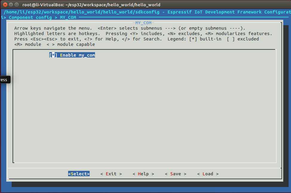 选择进入之后有一个[*]Enable my_com(进入默认状态是勾选的,这和我们编写的Kconfig文件是一样的),我们可以通过空格键选择是否用*勾选,