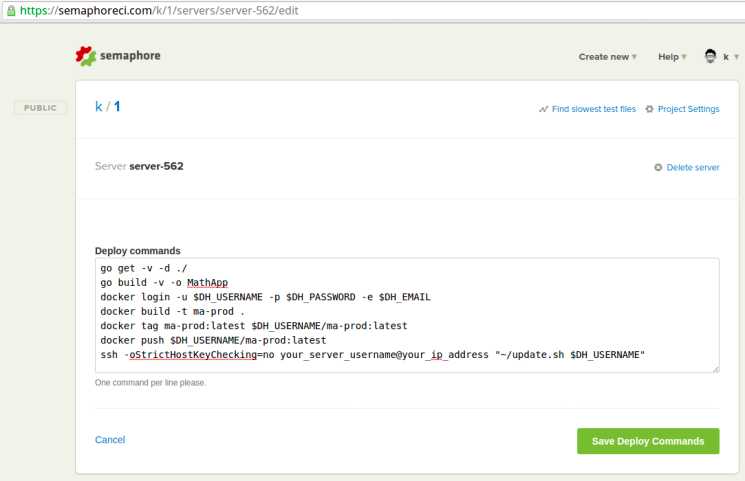 之后,我们将配置部署过程,Semaphore将创建新的image冰将其上传到Docker Hub中。一旦完成,一个Semaphore的命令将执行你的服务器上的脚本来初始化更新过程。