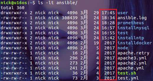默认的顺序为最新修改的文件在最顶端,你可以使用 r 选项来反转这个顺序。这里你还可以通过 --time 选项改变长格式输出的时间类型(比如 atime 或 ctime),t 选项会以你指定的时间类型进行排序。