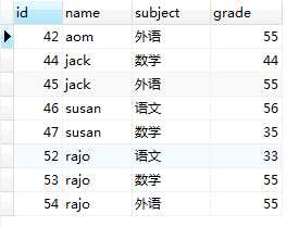 INSERT INTO student(`name`,`subject`,grade)VALUES(‘aom‘,‘语文‘,88); INSERT INTO student(`name`,`subject`,grade)VALUES(‘aom‘,‘数学‘,99); INSERT INTO student(`name`,`subject`,grade)VALUES(‘aom‘,‘外语‘,55); INSERT INTO student(`name`,`subject`,grade)VALUES(‘jack‘,‘语文‘,67); INSERT INTO student(`name`,`subject`,grade)VALUES(‘jack‘,‘数学‘,44); INSERT INTO student(`name`,`subject`,grade)VALUES(‘jack‘,‘外语‘,55); INSERT INTO student(`name`,`subject`,grade)VALUES(‘susan‘,‘语文‘,56); INSERT INTO student(`name`,`subject`,grade)VALUES(‘susan‘,‘数学‘,35); INSERT INTO student(`name`,`subject`,grade)VALUES(‘susan‘,‘外语‘,77); INSERT INTO student(`name`,`subject`,grade)VALUES(‘alice‘,‘语文‘,88); INSERT INTO student(`name`,`subject`,grade)VALUES(‘alice‘,‘数学‘,77); INSERT INTO student(`name`,`subject`,grade)VALUES(‘alice‘,‘外语‘,100); INSERT INTO student(`name`,`subject`,grade)VALUES(‘rajo‘,‘语文‘,33); INSERT INTO student(`name`,`subject`,grade)VALUES(‘rajo‘,‘数学‘,55); INSERT INTO student(`name`,`subject`,grade)VALUES(‘rajo‘,‘外语‘,55);