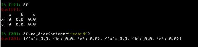 import numpy as np import pandas as pd index = [‘x‘, ‘y‘] columns = [‘a‘,‘b‘,‘c‘] dtype = [(‘a‘,‘int32‘), (‘b‘,‘float32‘), (‘c‘,‘float32‘)] values = np.zeros(2, dtype=dtype) df = pd.DataFrame(values, index=index) df.to_dict(orient=‘record‘)