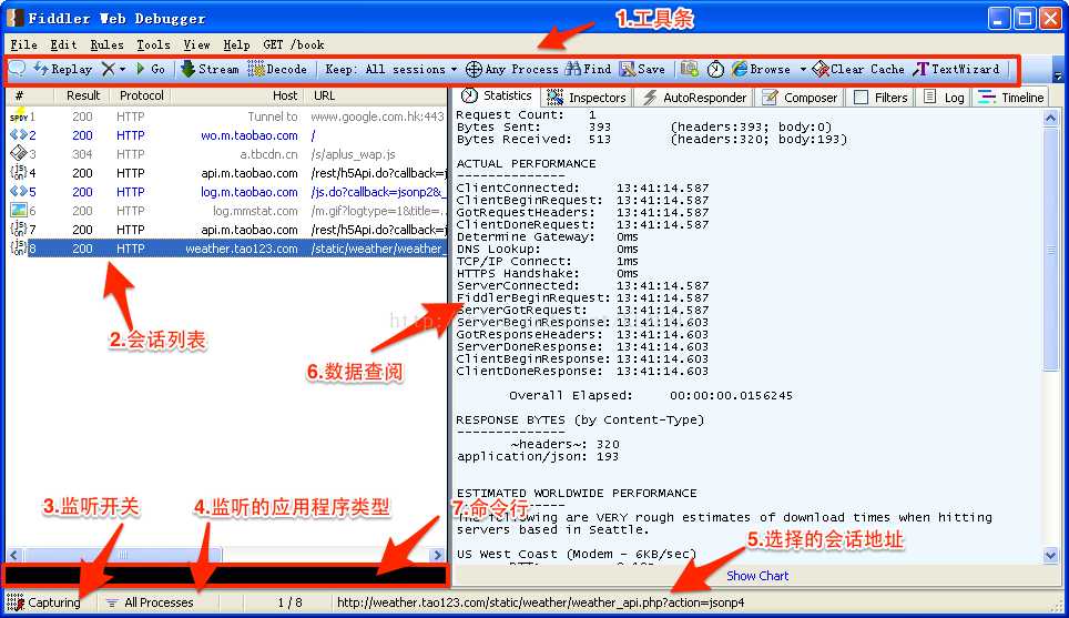 6 Timeline 页签:显示session请求到响应的时间表,横向为时间轴,纵向为session列表,鼠标移到timeline页签上,在底部会显示四个数据:session编号和URL、session的响应类型、发送字节数和接收字节数