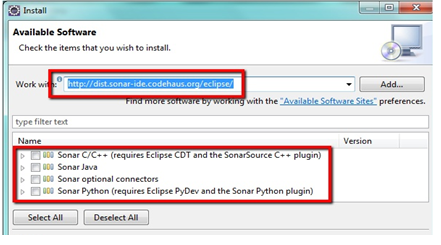 点击Help -> Install New Software,将弹出Install对话框。 复制地址http://dist.sonar-ide.codehaus.org/eclipse/ 到Work with栏并回车,将显示可用的插件和组件列表,如下图