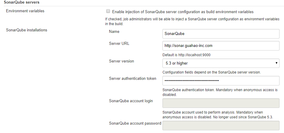 进入配置页面对sonar插件进行配置,如下图,sonar6只需要配置token即可。