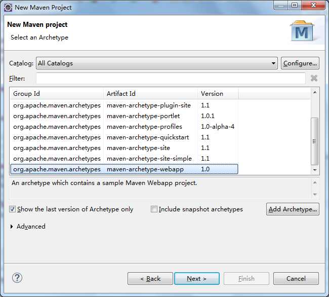 选择必须的maven -webapp 选择以后,点击下一步