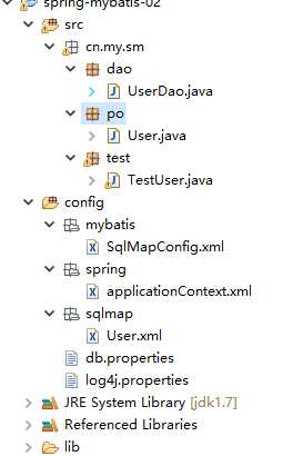 <?xml version="1.0" encoding="UTF-8"?> <beans xmlns="http://www.springframework.org/schema/beans" xmlns:xsi="http://www.w3.org/2001/XMLSchema-instance" xmlns:mvc="http://www.springframework.org/schema/mvc" xmlns:context="http://www.springframework.org/schema/context" xmlns:aop="http://www.springframework.org/schema/aop" xmlns:tx="http://www.springframework.org/schema/tx" xsi:schemaLocation="http://www.springframework.org/schema/beans http://www.springframework.org/schema/beans/spring-beans-3.2.xsd http://www.springframework.org/schema/mvc http://www.springframework.org/schema/mvc/spring-mvc-3.2.xsd http://www.springframework.org/schema/context http://www.springframework.org/schema/context/spring-context-3.2.xsd http://www.springframework.org/schema/aop http://www.springframework.org/schema/aop/spring-aop-3.2.xsd http://www.springframework.org/schema/tx http://www.springframework.org/schema/tx/spring-tx-3.2.xsd "> <!-- 数据源配置 dbcp --> <context:property-placeholder location="classpath:db.properties"/> <bean id="dataSource" class="org.apache.commons.dbcp.BasicDataSource" destroy-method="close"> <property name="driverClassName" value="${jdbc.driver}"></property> <property name="url" value="${jdbc.url}"></property> <property name="username" value="${jdbc.username}"></property> <property name="password" value="${jdbc.password}"></property> <property name="maxActive" value="10"></property> <property name="maxIdle" value="5"></property> </bean> <!-- 创建sqlsessionfactory --> <bean id="sqlSessionFactory" class="org.mybatis.spring.SqlSessionFactoryBean"> <property name="configLocation" value="mybatis/SqlMapConfig.xml"></property> <property name="dataSource" ref="dataSource"></property> </bean> <bean id="userDao" class="cn.my.sm.dao.UserDao" > <property name="sqlSessionFactory" ref="sqlSessionFactory"></property> </bean> </beans>