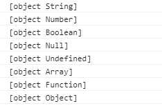 1 var a = Object.prototype.toString; 2 3 console.log(a.call("aaa")); 4 console.log(a.call(1)); 5 console.log(a.call(true)); 6 console.log(a.call(null)); 7 console.log(a.call(undefined)); 8 console.log(a.call([])); 9 console.log(a.call(function() {})); 10 console.log(a.call({}));