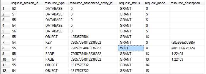 在开启另外一个update事务以后,我们再去查看当前的锁状况,如下图所示,我们发现在表(Object)级别上加了IX锁,在这张表所在的Page上也加了IX锁,因为表加了聚集索引,所以在叶子结点上加了X锁,这个锁的类型是KEY。