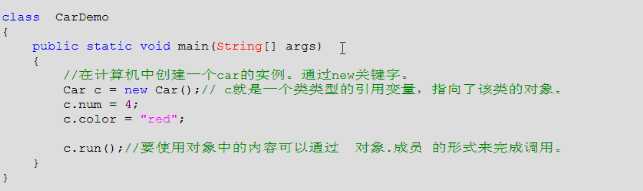 我们现在思考一下这个程序在计算机中的流程。这仅是个人理解,不一定对。由于创建对象的类中有主函数,那么开始加载入内存的应该是CarDemo,创建对象的类。我们先不看c.num=4; c.color=”red”; 这两个语句。c这个变量是在栈中的,它是属于主函数的局部变量,当然也会叫做类类型引用变量。同时堆内存中也会依照描述类中的描述,在堆内存中开辟Car类型的类,将其堆内存的地址给c局部变量。c会根据地址去堆内存中搜寻数据。至于描述类中的void main函数的位置是在哪呢?功能函数不清楚存放在哪个内存中,当运行c.run()时,是在调用函数,函数中的执行语句是输出num和color变量。由于是c调用的,c引用的是堆内存中的Car(),Car()中有根据描述类加载的变量num和color。这时调用输出,自然是输出Car()中的数据。如果是run()方法中已经有定义的num,和方法要有的输出变量一致,那么c在调用方法时,c.run()就直接按照方法中的执行语句,没有输入,直接输出num=10。这样一来就和描述类中的属性没有任何关联性。→这里得出的结论就是,描述;类中的成员变量和函数是独立,有些时候,函数中的执行语句会和成员变量搭上关系。一定要通过调用方法来输出成员变量么?可以直接输出。