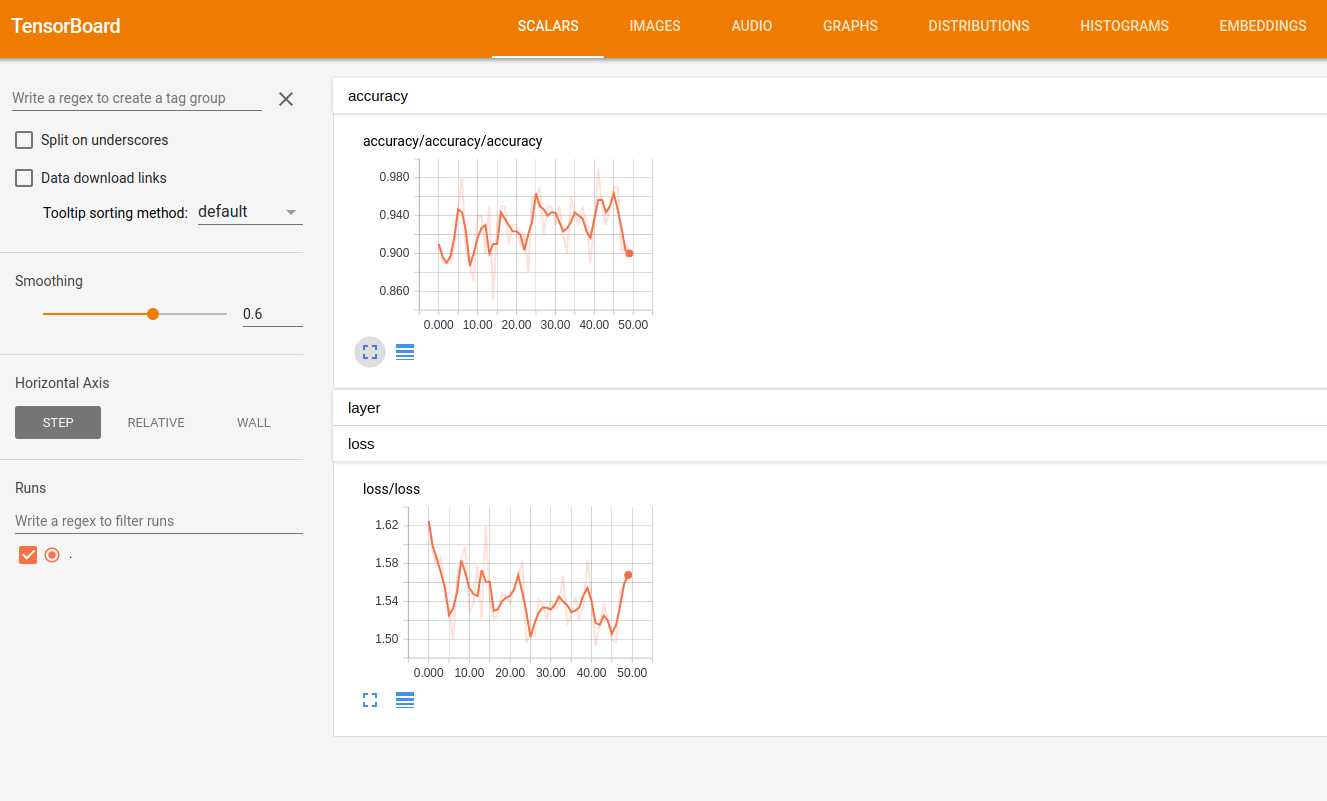 在浏览器中输入127.0.0.1:6006,可以看到可视化效果,如loss和accuracy的变化折线图