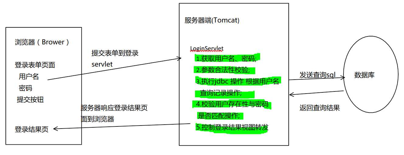 回想个人在JAVA WEB学习阶段,MVC思想没有建立之前,个人在实现网站用户登录功能的痛苦经历时,还是颇有感想,当时的实现方式现在想来不得不佩服当时的这种勇气,将登录的数据访问层代码,登录业务逻辑处理的代码以及登录参数获取视图转发控制的代码全部柔和到了一个Servlet 中进行处理,当然功能实现上是没有任何问题的,能够实现用户登录的功能,这个流程画图描述下来如下: