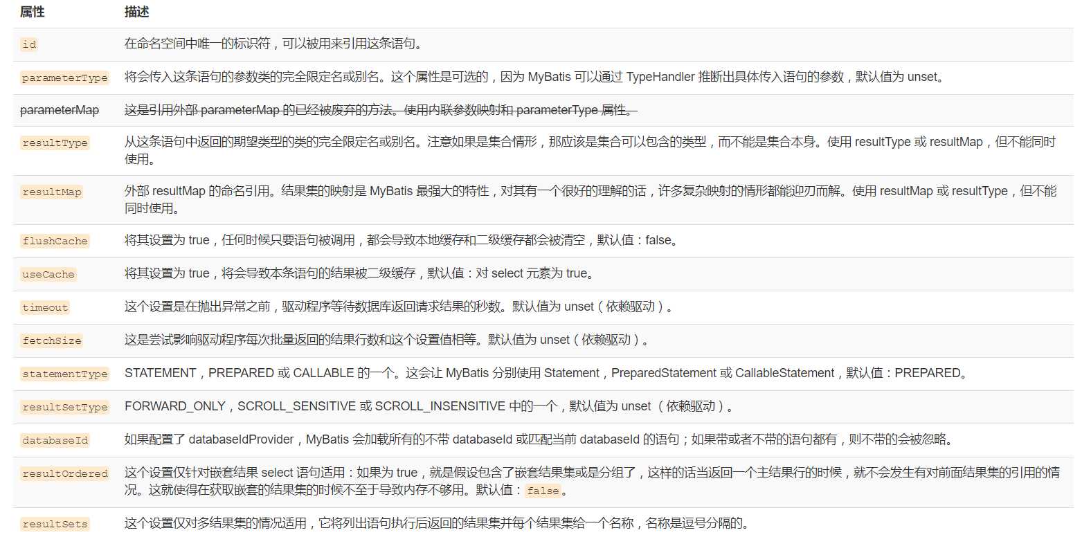 <!-- 配置文件的根元素 --> <configuration> <!-- 属性:定义配置外在化 --> <properties></properties> <!-- 设置:定义mybatis的一些全局性设置 --> <settings> <!-- 具体的参数名和参数值 --> <setting name="" value=""/> </settings> <!-- 类型名称:为一些类定义别名 --> <typeAliases></typeAliases> <!-- 类型处理器:定义Java类型与数据库中的数据类型之间的转换关系 --> <typeHandlers></typeHandlers> <!-- 对象工厂 --> <objectFactory type=""></objectFactory> <!-- 插件:mybatis的插件,插件可以修改mybatis的内部运行规则 --> <plugins> <plugin interceptor=""></plugin> </plugins> <!-- 环境:配置mybatis的环境 --> <environments default=""> <!-- 环境变量:可以配置多个环境变量,比如使用多数据源时,就需要配置多个环境变量 --> <environment id=""> <!-- 事务管理器 --> <transactionManager type=""></transactionManager> <!-- 数据源 --> <dataSource type=""></dataSource> </environment> </environments> <!-- 数据库厂商标识 --> <databaseIdProvider type=""></databaseIdProvider> <!-- 映射器:指定映射文件或者映射类 --> <mappers></mappers> </configuration>