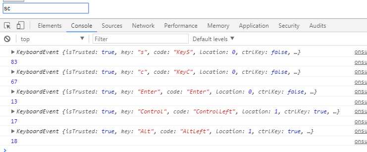 1 <!DOCTYPE html> 2 <html lang="en"> 3 <head> 4 <meta charset="UTF-8"> 5 <title>Title</title> 6 </head> 7 <body> 8 <input type="text" class="test"> 9 <input type="text" id="t1"/> 10 <script> 11 //测试event对象 12 var ele = document.getElementsByClassName(‘test‘)[0]; 13 // event :每次触发事件时所有的状态信息 14 // event.keyCode :保存着所有的状态信息 15 ele.onkeydown =function (event) { 16 // onkeydown按下键盘触发的事件 17 console.log(event); 18 console.log(event.keyCode); 19 if (event.keyCode==13){ 20 //按回车就会弹出 21 alert(666) 22 } 23 } 24 </script> 25 <script type="text/javascript"> 26 var ele=document.getElementById("t1"); 27 ele.onkeydown=function(e){ 28 e=e||window.event; 29 var keynum=e.keyCode; 30 var keychar=String.fromCharCode(keynum); 31 // console.log(keynum); //每次键盘敲下的状态信息 32 // console.log(keychar); //输入的字符 33 // alert(keynum); 34 // alert(keychar) //你键盘输入的字符 35 }; 36 </script> 37 </body> 38 </html>