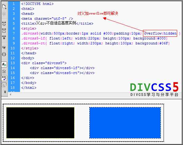 <!DOCTYPE html> <html> <head> <meta charset="utf-8" /> <title>父div不自适应高度实例</title> <style> .divcss5{ width:500px; border:1px solid #000; padding:10px} .divcss5-lf{ float:left; width:220px; height:100px; background:#000} .divcss5-rt{ float:right; width:230px; height:100px; background:#06F} </style> </head> <body> <div class="divcss5"> <div class="divcss5-lf"></div> <div class="divcss5-rt"></div> </div> </body> </html>