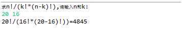 import java.util.Scanner; import java.math.BigInteger; public class CombinatorialNumber1 { /** * @param args */ public static void main(String[] args) { // TODO Auto-generated method stub System.out.println("求n!/(k!*(n-k)!),请输入n和k:");//提示用户输入n和k Scanner input=new Scanner(System.in); int n=0,k=0; if(input.hasNextInt())//判断n是否是整型 { n=input.nextInt();//输入n的值 } else//n输入的不是整型,报错并结束程序 { System.out.println("您输入的数据有错!"); System.exit(0); } if(input.hasNextInt())//判断k是否是整型 { k=input.nextInt();//输入k的值 } else//n输入的不是整型,报错并结束程序 { System.out.println("您输入的数据有错!"); System.exit(0); } if(n>=k)//因要求(n-k)!,所以需要判断n>=k是否成立 { //调用方法分别计算n!、k!、(n-k)!,计算最后结果并输出 System.out.print(n+"!/("+k+"!*("+n+"-"+k+")!))="+calculateN(n).divide((calculateN(k).multiply(calculateN(n-k))))); } else//n<k,无法计算,报错并结束程序 { System.out.println("您输入的数据有错!"); System.exit(0); } } public static BigInteger calculateN(int n) //计算n! { if(n==1||n==0)//判断h是否为1或0,若是,则无需进行递归,其阶乘为1 { return BigInteger.valueOf(1); } return BigInteger.valueOf(n).multiply(calculateN(n-1));//递归调用calculateN方法 } }