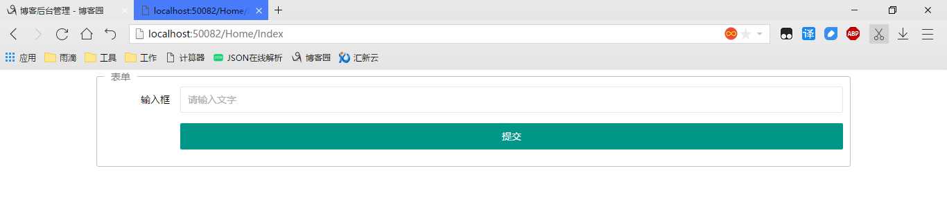 1 <html> 2 <head> 3 <title>Default</title> 4 <!-- CSS文件引用 --> 5 <link href="/Content/Script/Plug/layui/css/layui.css" rel="stylesheet"> 6 </head> 7 <body> 8 9 <form action="/Home/Default" method="post" class="layui-form" style="width:80%;margin:0px auto;"> 10 <fieldset> 11 <legend>表单</legend> 12 <!-- 输入框 --> 13 <div class="layui-form-item"> 14 <label class="layui-form-label">输入框</label> 15 <div class="layui-input-block"> 16 <input type="text" name="title" placeholder="请输入文字" class="layui-input"> 17 </div> 18 </div> 19 <!-- 提交按扭 --> 20 <div class="layui-form-item"> 21 <div class="layui-input-block"> 22 <input type="submit" class="layui-btn layui-btn-block"> 23 </div> 24 </div> 25 26 </fieldset> 27 </form> 28 <!-- JS文件引用 --> 29 <script src="/Content/Script/jquery-3.2.1.min.js"></script> 30 <script src="/Content/Script/Plug/layui/layui.all.js"></script> 31 32 </body> 33 </html>