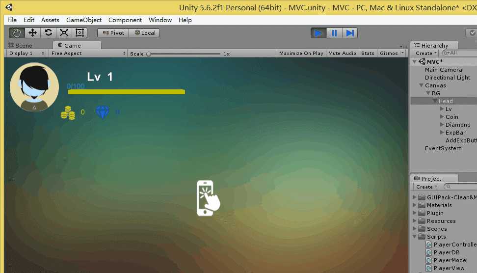 :模拟 按Button增加经验,经验改变后,玩家达到当前等级*100经验后升级,升级后给玩家增加当前等级*10的金币,每3级增加钻石10;