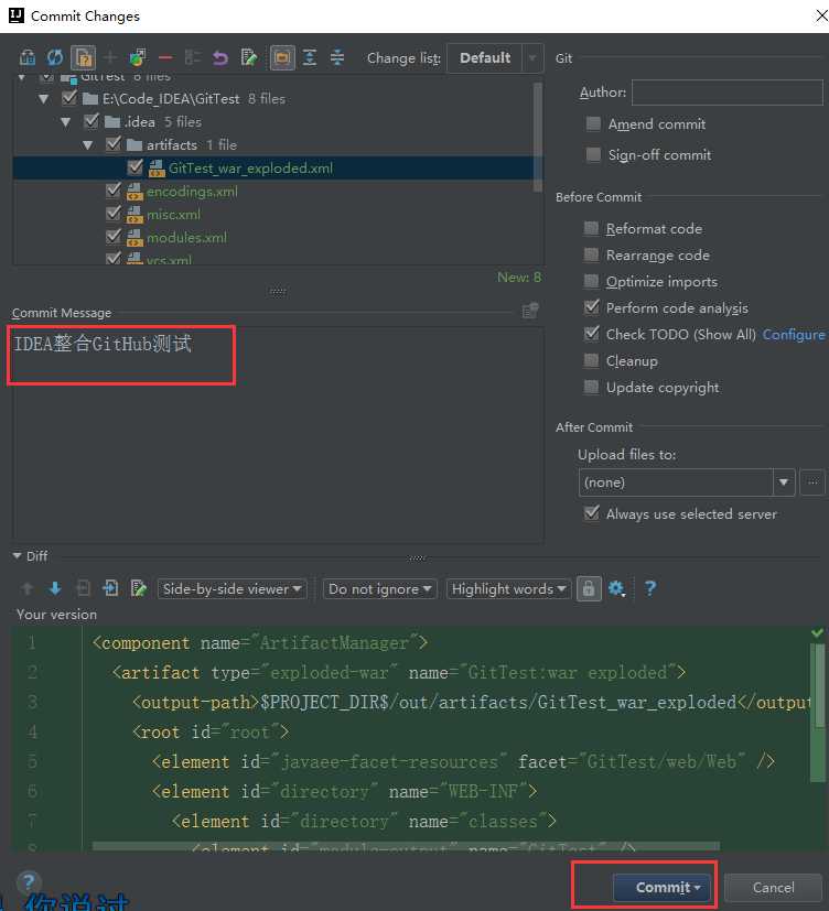 项目右键Git--> Commit Directory,在弹窗中输入Commit Message,点击commit,此时项目文件从暂存区真正进入版本库中,项目文件变成白色