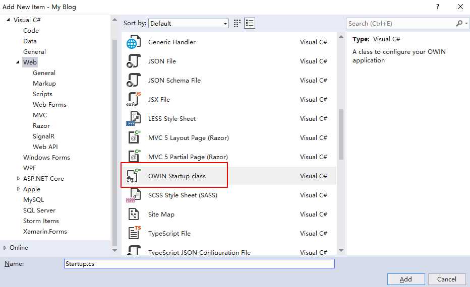 1. 创建一个Owin Startup类文件: