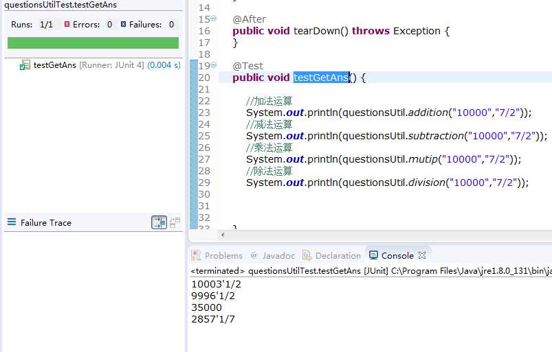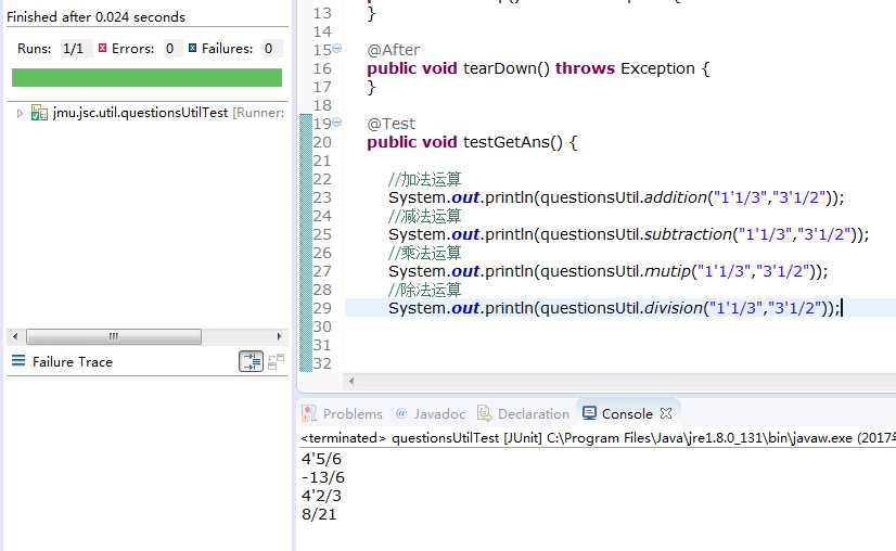 与运算相关的代码 // 自定义除法运算,两种形式 public static String division(String str1, String str2) { if(str2.equals("0")) { try { throw(new Exception("除数不能为0")); } catch (Exception e) { // TODO Auto-generated catch block e.printStackTrace(); } } int[] a = decompose(str1); int[] b = decompose(str2); int c = (a[0] * a[2] + a[1]) * b[2]; int d = a[2] * (b[0] * b[2] + b[1]); return division(c, d); } public static String division(int str1, int str2) { if (str1 % str2 == 0) { return String.valueOf(str1 / str2); } int[] str = reduction(str1, str2); if (str1 > str2) { int s = str[0] / str[1]; int t = str[0] - str[1] * s; return s + "‘" + t + "/" + str[1]; } else { return str[0] + "/" + str[1]; } } // 自定义乘法运算 public static String mutip(String str1, String str2) { int[] a = decompose(str1); int[] b = decompose(str2); int c = (a[0] * a[2] + a[1]) * (b[0] * b[2] + b[1]); int d = a[2] * b[2]; return division(c, d); } // 自定义加法运算 public static String addition(String str1, String str2) { int[] a = decompose(str1); int[] b = decompose(str2); int c = ((a[0] * a[2] + a[1]) * b[2]) + ((b[0] * b[2] + b[1]) * a[2]); int d = a[2] * b[2]; return division(c, d); } // 自定义减法运算 public static String subtraction(String str1, String str2) { int[] a = decompose(str1); int[] b = decompose(str2); int c = ((a[0] * a[2] + a[1]) * b[2]) - ((b[0] * b[2] + b[1]) * a[2]); int d = a[2] * b[2]; return division(c, d); } // 约分 private static int[] reduction(int a, int b) { for (int i = 2; i < RANG / 2; i++) { while (a % i == 0 && b % i == 0) { a = a / i; b = b / i; } } int[] as = { a, b }; return as; } private static int[] decompose(String str) { int[] container = new int[3]; if (str.contains("‘")) { container[0] = Integer.parseInt(str.split("‘")[0]); container[1] = Integer.parseInt(str.split("‘")[1].split("/")[0]); container[2] = Integer.parseInt(str.split("‘")[1].split("/")[1]); } else if (str.contains("/")) { container[0] = 0; container[1] = Integer.parseInt(str.split("/")[0]); container[2] = Integer.parseInt(str.split("/")[1]); } else { container[0] = 0; container[1] = Integer.parseInt(str); container[2] = 1; } return container; }