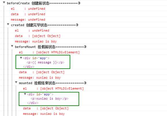 <div id="app"> <p>{{ message }}</p> </div> <script type="text/javascript"> var app = new Vue({ el: ‘#app‘, data: { message : "xuxiao is boy" }, beforeCreate: function () { console.group(‘beforeCreate 创建前状态===============》‘); console.log("%c%s", "color:red" , "el : " + this.$el); //undefined console.log("%c%s", "color:red","data : " + this.$data); //undefined console.log("%c%s", "color:red","message: " + this.message) }, created: function () { console.group(‘created 创建完毕状态===============》‘); console.log("%c%s", "color:red","el : " + this.$el); //undefined %c 格式化占位符 - css格式化样式 console.log("%c%s", "color:red","data : " + this.$data); //已被初始化 console.log("%c%s", "color:red","message: " + this.message); //已被初始化 }, beforeMount: function () { console.group(‘beforeMount 挂载前状态===============》‘); console.log("%c%s", "color:red","el : " + (this.$el)); //已被初始化 console.log(this.$el); console.log("%c%s", "color:red","data : " + this.$data); //已被初始化 console.log("%c%s", "color:red","message: " + this.message); //已被初始化 }, mounted: function () { console.group(‘mounted 挂载结束状态===============》‘); console.log("%c%s", "color:red","el : " + this.$el); //已被初始化 console.log(this.$el); console.log("%c%s", "color:red","data : " + this.$data); //已被初始化 console.log("%c%s", "color:red","message: " + this.message); //已被初始化 }, beforeUpdate: function () { console.group(‘beforeUpdate 更新前状态===============》‘); console.log("%c%s", "color:red","el : " + this.$el); console.log(this.$el); console.log("%c%s", "color:red","data : " + this.$data); console.log("%c%s", "color:red","message: " + this.message); }, updated: function () { console.group(‘updated 更新完成状态===============》‘); console.log("%c%s", "color:red","el : " + this.$el); console.log(this.$el); console.log("%c%s", "color:red","data : " + this.$data); console.log("%c%s", "color:red","message: " + this.message); }, beforeDestroy: function () { console.group(‘beforeDestroy 销毁前状态===============》‘); console.log("%c%s", "color:red","el : " + this.$el); console.log(this.$el); console.log("%c%s", "color:red","data : " + this.$data); console.log("%c%s", "color:red","message: " + this.message); }, destroyed: function () { console.group(‘destroyed 销毁完成状态===============》‘); console.log("%c%s", "color:red","el : " + this.$el); console.log(this.$el); console.log("%c%s", "color:red","data : " + this.$data); console.log("%c%s", "color:red","message: " + this.message) } }) </script>