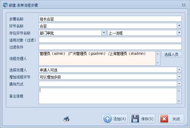 在流程定义里面,我们创建一个会签的流程步骤,我们以请假单为例,加入我们要求请假需要由各组长会签通过,然后在继续下面的部门审批、总经理审批步骤,如下所示。