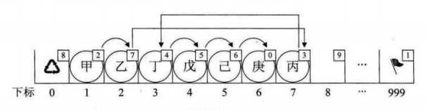 当存放入一些数据时("甲""乙""丁""戊""己""庚"),静态链表为: