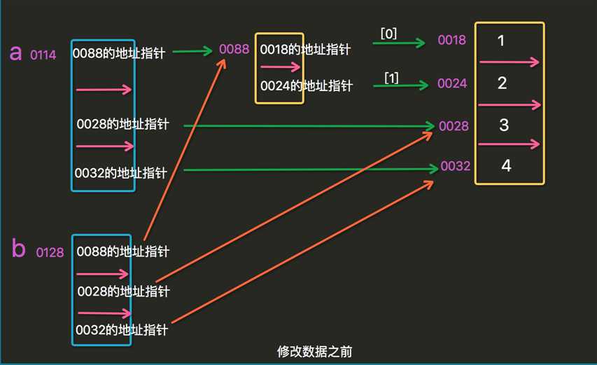 1 #不可变数据类型:数字,字符串,元组 可变类型:列表,字典 2 l=[2,2,3] 3 print(id(l)) # 35557064 4 l[0]=5 5 print(id(l)) # 35557064 # 当你对可变类型进行修改时,比如这个列表对象l,它的内存地址不会变化,注意是这个列表对象l,不是它里面的元素 6 # this is the most important 7 8 s=‘alex‘ 9 print(id(s)) #像字符串,列表,数字这些不可变数据类型,,是不能修改的,比如我想要一个‘Alex‘的字符串,只能重新创建一个‘Alex‘的对象,然后让指针只想这个新对象 10 11 s[0]=‘e‘ #报错 12 print(id(s)) 13 14 #重点:浅拷贝 15 a=[[1,2],3,4] 16 b=a[:]#b=a.copy() 17 18 # id地址全相同 19 print(a,b) # [[1, 2], 3, 4] [[1, 2], 3, 4] 20 print(id(a),id(b)) # 41848776 41869448 21 print(‘*************‘) 22 print(‘a[0]:‘,id(a[0]),‘b[0]:‘,id(b[0])) # a[0]: 41848712 b[0]: 41848712 23 print(‘a[0][0]:‘,id(a[0][0]),‘b[0][0]:‘,id(b[0][0])) # a[0][0]: 2006304432 b[0][0]: 2006304432 24 print(‘a[0][1]:‘,id(a[0][1]),‘b[0][1]:‘,id(b[0][1])) # a[0][1]: 2006304464 b[0][1]: 2006304464 25 print(‘a[1]:‘,id(a[1]),‘b[1]:‘,id(b[1])) # a[1]: 2006304496 b[1]: 2006304496 26 print(‘a[2]:‘,id(a[2]),‘b[2]:‘,id(b[2])) # a[2]: 2006304528 b[2]: 2006304528 27 28 29 print(‘___________________________________________‘) 30 b[0][0]=8 #[1, 2]--》[8, 2] 31 32 33 print(a,b) # [[8, 2], 3, 4] [[8, 2], 3, 4] 34 print(id(a),id(b)) # 35893576 35893704 35 print(‘*************‘) 36 print(‘a[0]:‘,id(a[0]),‘b[0]:‘,id(b[0])) # a[0]: 35893512 b[0]: 35893512 37 print(‘a[0][0]:‘,id(a[0][0]),‘b[0][0]:‘,id(b[0][0])) # a[0][0]: 2006304656 b[0][0]: 2006304656 38 print(‘a[0][1]:‘,id(a[0][1]),‘b[0][1]:‘,id(b[0][1])) # a[0][1]: 2006304464 b[0][1]: 2006304464 39 print(‘a[1]:‘,id(a[1]),‘b[1]:‘,id(b[1])) # a[1]: 2006304496 b[1]: 2006304496 40 print(‘a[2]:‘,id(a[2]),‘b[2]:‘,id(b[2])) # a[2]: 2006304528 b[2]: 2006304528