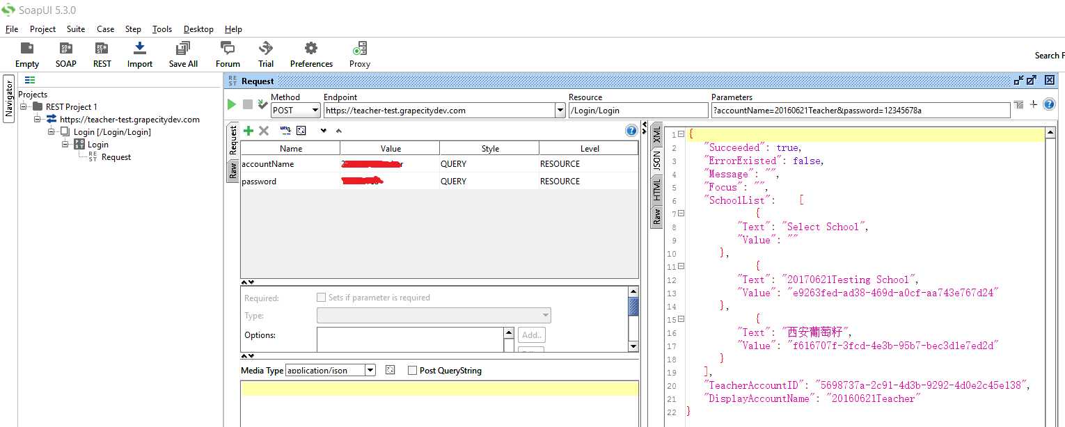 参照下图需要在 Resource 输入框输入 /Login/Login 路由,并在 Params 中输入登录时需要的查询参数 accountName 和 password。