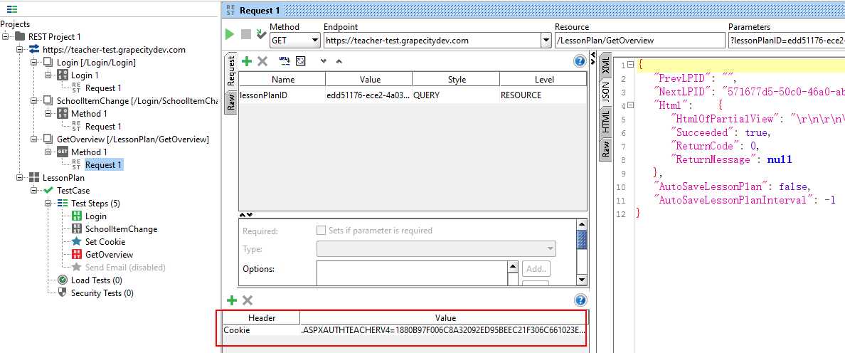 这是通过 Groovy Script 语法,获取上一个请求的返回值(此处是获取 SchoolItemChange 接口的返回值”Set-Cookie”),并将”Set-Cookie”属性值赋予下一个请求 GetOverview 的请求头 Cookie 中,是不是和第2,3条很应景啊?!这样就很好的解决了接口自动化测试,不用复制粘贴请求之间依赖的返回值。