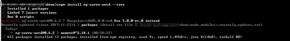 ng new demo项目,npm install,之后再npm install ng-zrrro-antd,出现了一个不赞成警告,和报错信息一样 指向的是@angular/cdk5.0.0这个包。