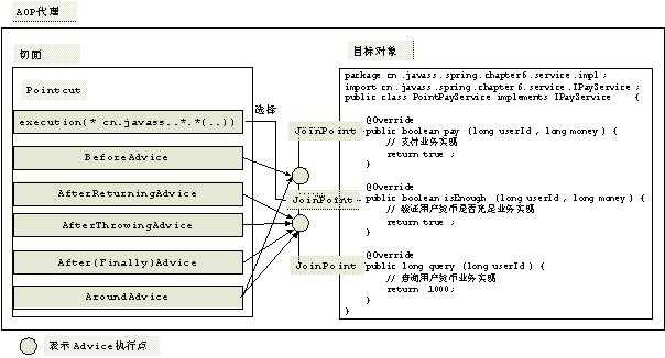 在AOP中,通过切入点选择目标对象的连接点,然后在目标对象的相应连接点处织入通知,而切入点和通知就是切面(横切关注点),而在目标对象连接点处应用切面的实现方式是通过AOP代理对象,如下图所示。