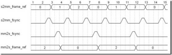 写通道(S2MM):当配置为Genlock Master时,该通道不会跳过或者重复任一帧数据,并把当前帧的编号输出到s2mm_frame_ptr_out端口。通道不会检测s2mm_frame_ptr_in端口提供的帧编号。Genlock Slave通道应跟随Genlock Master通道变化,但有一定的延迟。延迟大小预定义在寄存器中(*frmdly_stride[28:24])。