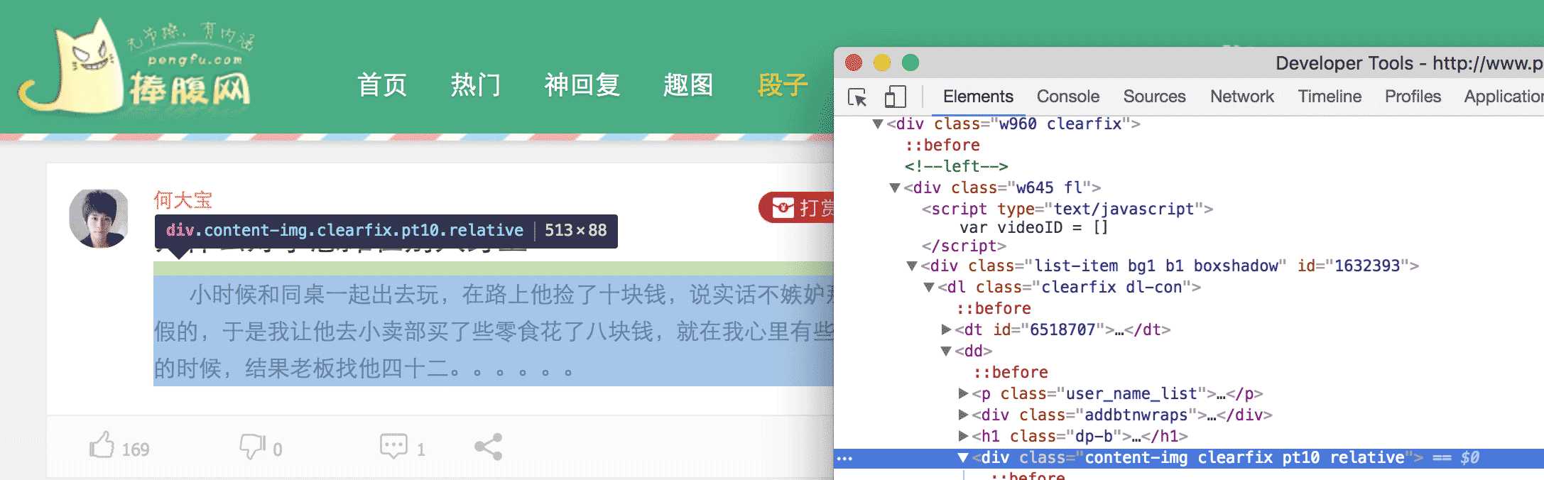 简单地说,我们要把网页上特定位置的内容,扒拉下来,具体怎么扒拉,我们得先分析这个网页,看那块内容是我们需要的。比如,这次爬取的是捧腹网上的笑话,打开 捧腹网段子页我们可以看到一大堆笑话,我们的目的就是获取这些内容。看完回来冷静一下,你这样一直笑,我们没办法写代码。在 chrome 中,我们打开 审查元素 然后一级一级的展开 HTML 标签,或者点击那个小鼠标,定位我们所需要的元素。
