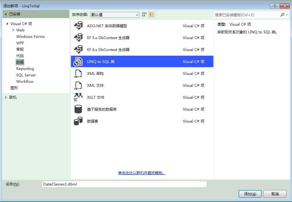 新建类库LinqToSql,右击类库添加LinqToSql类。如图: