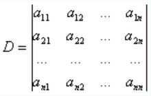 式中k1,k2,...,kn是将序列1,2,...,n的元素次序交换k次所得到的一个序列,Σ号表示对k1,k2,...,kn取遍1,2,...,n的一切排列求和,那末数D称为n阶方阵相应的行列式.例如,四阶行列式是4!个形为