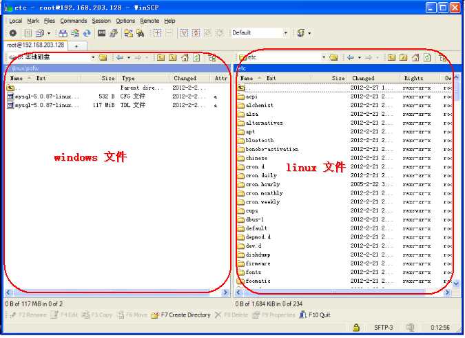 登陆之后,本地windows xp系统下的文件与远程linux系统下的文件分别显示在左右两个窗体内,我们在windows 窗体内找到需要上传的文件,拖拉到linux窗体内即可实现了上传操作。