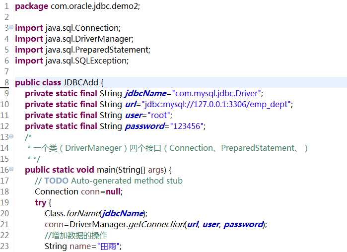 * 一个类(DriverManeger)四个接口(Connection、PreparedStatement、ResultSet、)