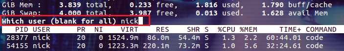 如果你想查看以某个用户权限启动的进程,可以使用小写字母 u 。这会提示你输入用户的名称,在你输入用户名称后,按回车键: