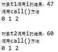public class ob2 { int i=47; public void call() { System.out.println("调用call()方法"); for(i=0;i<3;i++) { System.out.print(i+" "); if(i==2) { System.out.println("\n"); } } } public ob2() {//定义构造方法 } public static void main(String[] args) { ob2 t1=new ob2();//创建对象t1 ob2 t2=new ob2();//创建对象t2 t2.i=60; System.out.println("对象t1调用i的结果:"+t1.i);//依然是47 t1.call(); System.out.println("对象t2调用i的结果:"+t2.i); t2.call(); } }