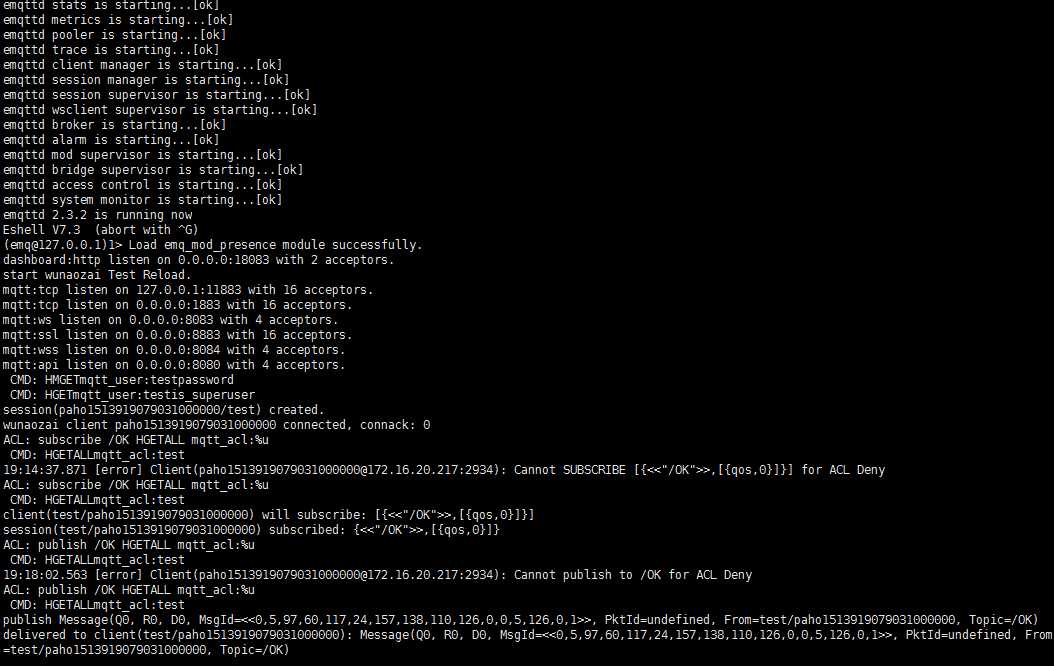 ./_rel/emqttd/bin/emqttd console 启动mqtt服务器,修改cache ./_rel/emqttd/etc/emq.conf 改为 mqtt.cache_acl = false