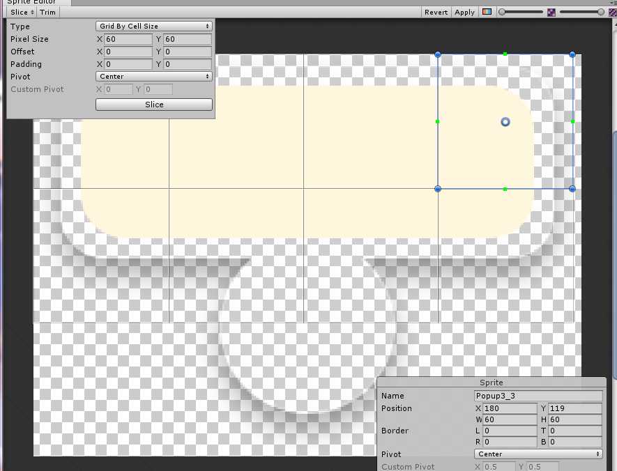 1.选中图片,在Inspector面板里将Texture Type改为Sprite,点击Sprite Editor按钮,通过拖动绿色的点来设置九宫格大小。