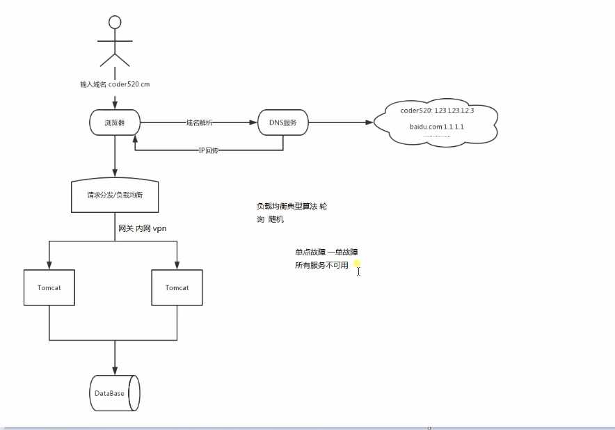 上图所示,这样虽然解决了单点故障,容量也提升了,但是又出现问题了,1.DNS服务器完全暴露在外网,造成不安全。2入口不集中。3.如果其中一个Tomcat挂了,那么用户通过对应的IP进入了那个坏的tomcat,还是不可以访问,这样很明显不行。